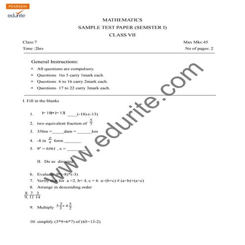 Class 7 Cbse Maths Sample Paper Term 1 Model 1